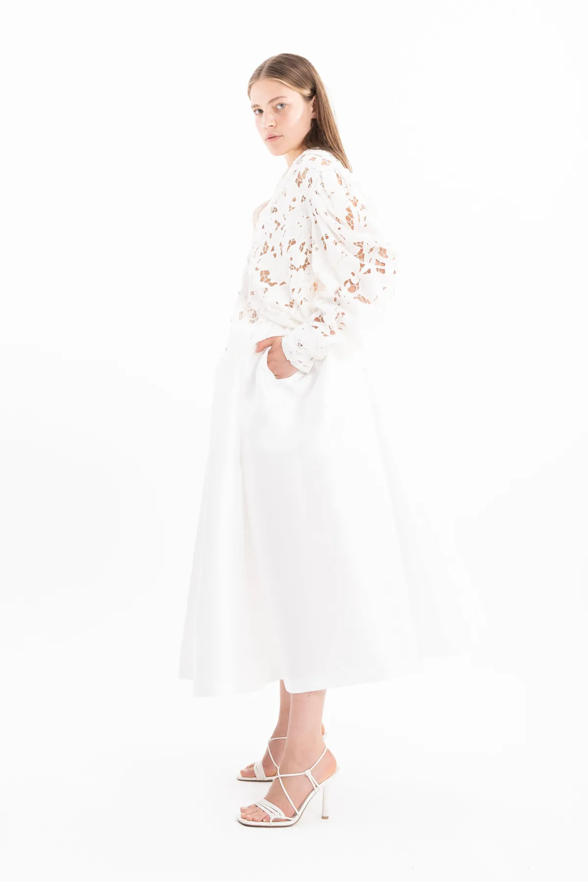 Crafted from white embroidered cotton, this shirt features dramatic puff shoulders leading into sleeves that will surely cause a lasting impression!