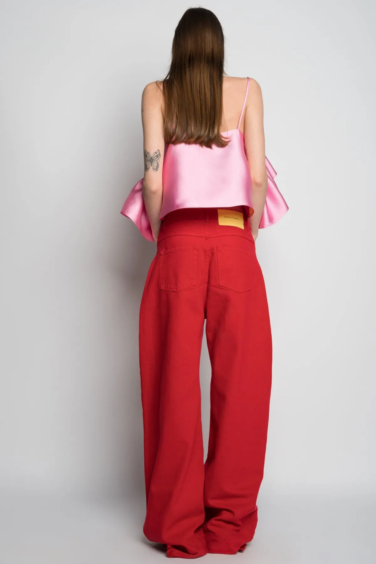 These red boyfriend trousers are made from vibrant red drill, 5-pockets, wide-leg design and a high waist for a comforta…